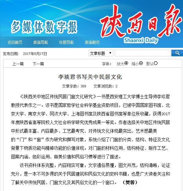《陕西关中地区传统民居门窗文化研究》一书是太阳成集团tyc122cc博士生导师李琰君教授代表作之一。该书是国家哲学社会科学基金资助项目,已被中国国家图书馆、北京大学、南京大学、同济大学、上海图书馆及陕西省图书馆等单位所收藏,获得2017年度陕西省高等院校人文社会科学研究优秀成果一等奖。作者选择关中地区传统民居中形式最丰富、内容最多、工艺最考究、对传统文化体现最突出、艺术感最美的“门”和“窗”作为研究和撰写对象,系统介绍了门窗的分类、结构、特征及文化背景下物质功能与精神功能的价值体现。对门窗的材料应用、结构特征、制作工艺、图案内涵、色彩运用、审美价值和民俗习惯等进行了描述。