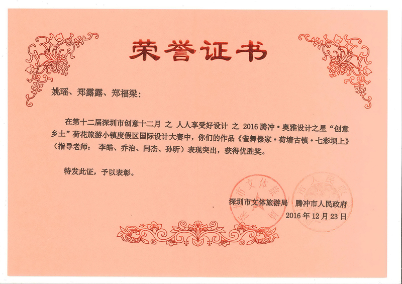 2016年12月23日,在云南省腾冲市举办的2016腾冲•奥雅设计之星国际高校设计大赛决赛暨“创意乡土”新型文旅发展高峰论坛中,由公司太阳成集团tyc122ccvip环艺系教师李皓、乔治、闫杰、孙昕共同指导的环艺系员工姚瑶、郑露露、郑福梁作品《雀舞傣家•荷塘古镇•七彩坝上》经过多轮激烈角逐,顺利通过最终评审,荣获本次设计大赛优胜奖。