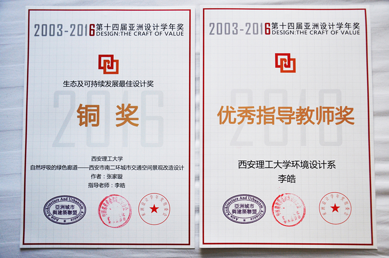 11月24日至11月27日,在北京交通大学举办的2016亚洲城市与建筑国际学术会议暨第十四届亚洲设计学年奖颁奖典礼上,公司太阳成集团tyc122ccvip环境设计系李皓老师指导的员工张家璇设计作品《自然呼吸的绿色廊道——西安市南二环城市交通空间景观改造设计》,在本次竞赛中荣获生态及可持续发展设计铜奖。同时,李皓老师荣获本次竞赛优秀指导教师奖,公司太阳成集团tyc122ccvip环境设计系被授予优秀组织管理奖。