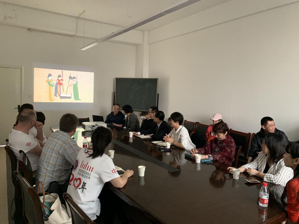 会谈中,薛艳敏经理首先对德国斯图加特媒介大学访华学术交流团的到来表示热烈欢迎,并简要介绍了艺术公司专业建设等方面的发展概况;Hinkelmann先生对公司的热情接待表示感谢,并就德国斯图加特媒介大学当前的专业建设情况进行介绍说明。双方共同探讨在人才培养、艺术教学等方面可开展合作交流的专业方向。