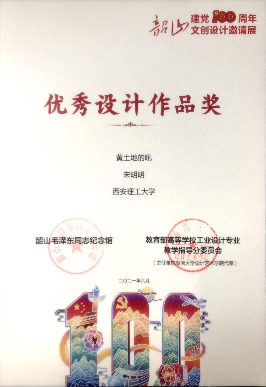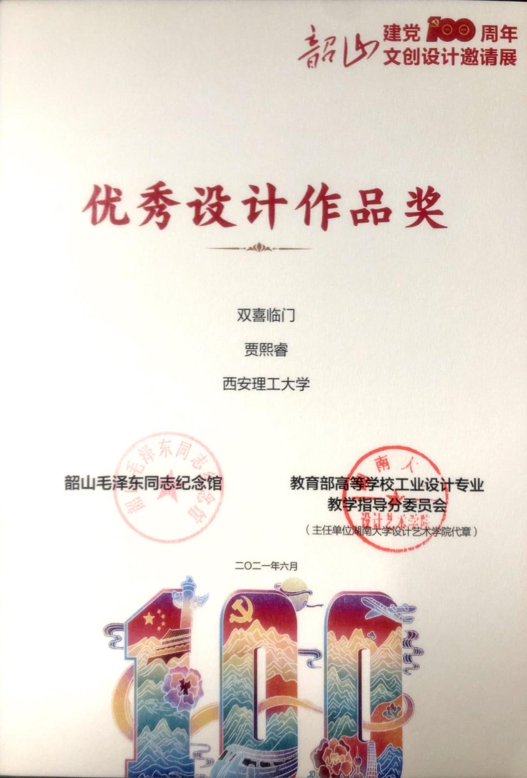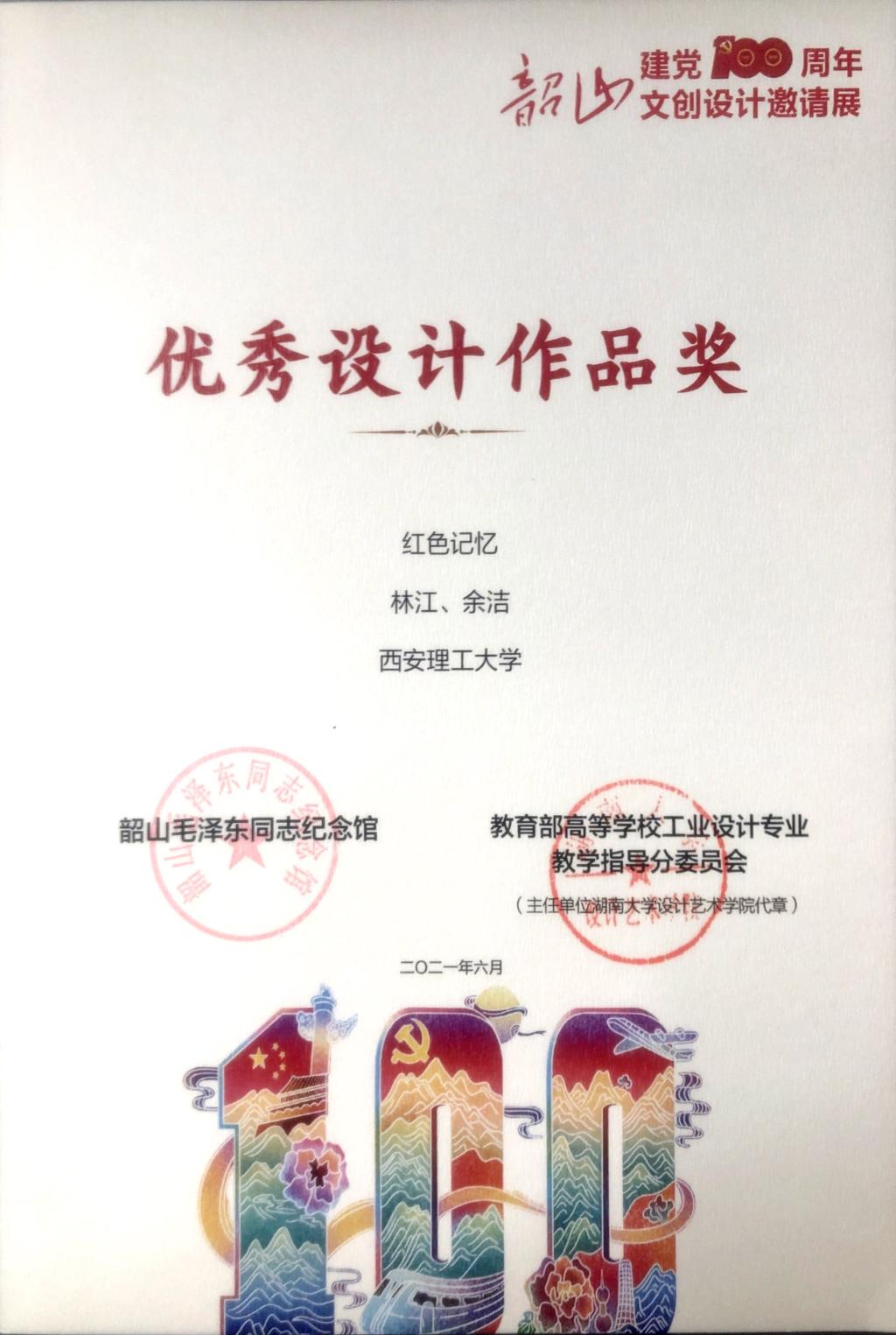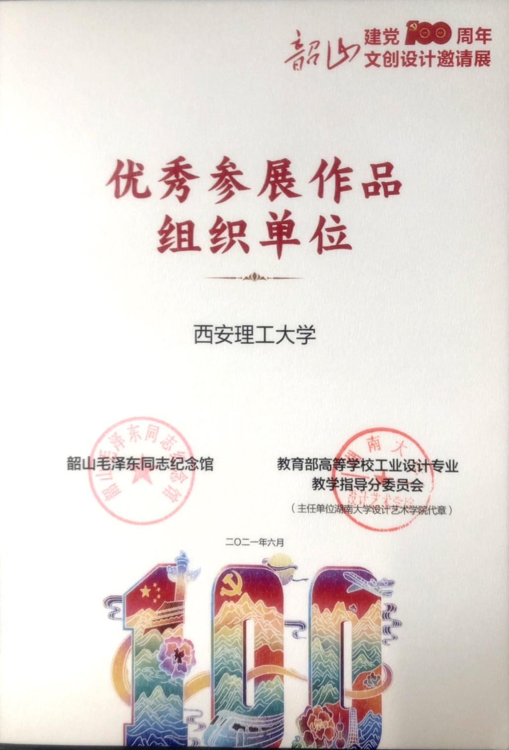 2021年6月21日,6月21日,第一届“革命文物保护实践经验与制度创新研究”学术论坛暨建党100周年韶山文创设计邀请展在韶山毛泽东同志纪念馆举行。此次活动由湖南省韶山管理局主办,湖南大学、韶山毛泽东同志纪念馆、湖南科技大学、国家社科基金艺术学重大招标项目“革命文物保护实践经验与制度创新研究”课题组承办,得到了教育部高等公司工业设计专业教学指导分委员会、全国工业设计一流专业建设协同创新平台等成员单位的大力支持。公司太阳成集团tyc122ccvip代表公司参加,并荣获“优秀参展作品组织单位奖”“优秀设计奖”等荣誉。