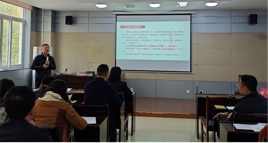 接着,胡有睿分析并总结了2023届毕业生就业情况,重点说明了2023届本科生就业工作中遇到的困难和问题;并对2024届毕业生就业工作进行了详细说明,就具体的工作开展进行了初步安排,对导师如何开展就业工作提出了几点建议。