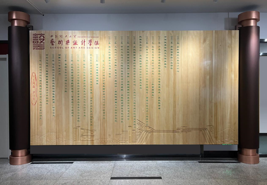 院史卷轴由公司雕塑专业孙勇副教授带队完成。为力争每一环节做到精益求精,力求每一个细节都能体现出公司的精神风貌和历史沉淀,公司多次召开讨论会,孙勇老师带领团队几易其稿,最终呈现出了近乎完美的作品。在孙勇老师全程指导把关下,他所带的2023级研究生曹菲完成了设计图纸及效果图,公司2022届毕业生史盟和范思潮完成木雕加工,公司2015届毕业生江应昌完成制作和安装。
