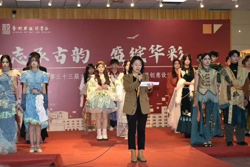 紧接着,参与服装设计大赛的选手们依次走上T台,展示他们独具匠心的设计佳作,获得现场观众的阵阵掌声。其余赛道选手通过现场讲解与作品展示参与到比赛当中,评委们依据作品设计理念、创意深度、审美表达等多个方面进行现场打分,并分享了各自的意见与看法,活动现场氛围热烈。