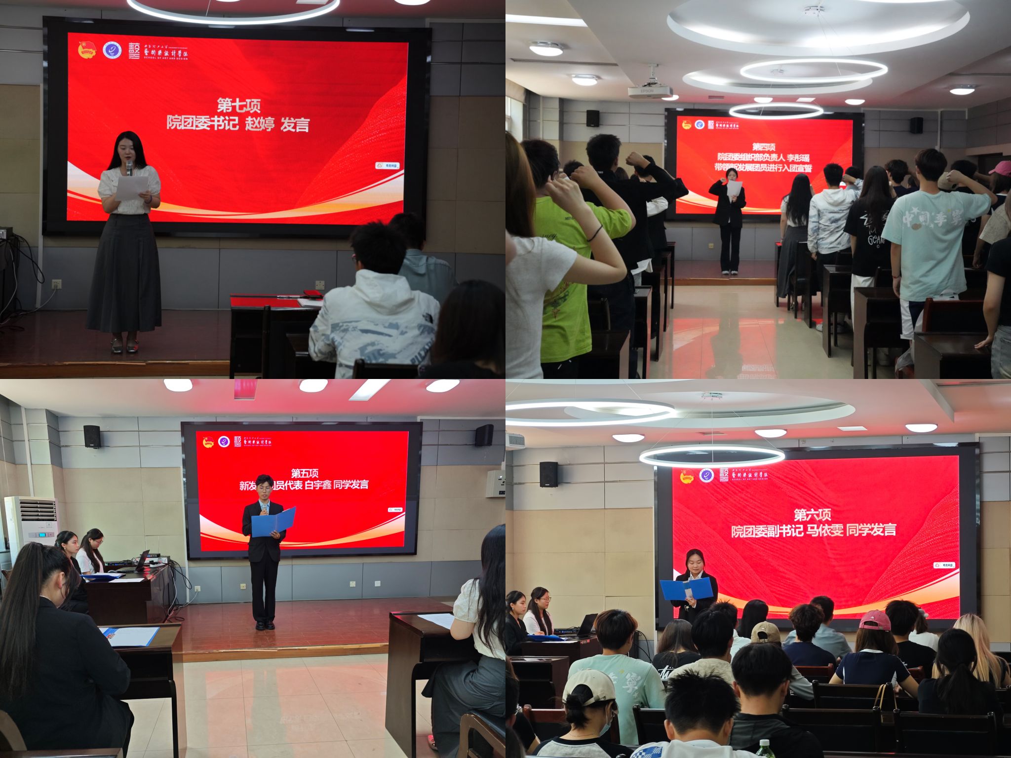 院团委组织部负责人党佳怡宣布了2024年度秋季新发展团员名单,随后,赵婷和郭旭东为新发展团员代表佩戴团徽、颁发团员证;院团委组织部负责人李彤瑶带领新发展团员进行了入团宣誓;新团员代表白宇鑫代表全体新入团的青年表态,将以入团为全新起点,把责任扛在肩头,在实践磨砺中增长才干;优秀团员代表马依雯号召新团员要将入团誓词铭刻于心,永葆赤诚初心,以实际行动践行团员责任,努力成长为堪当时代重任的新时代共青团员。