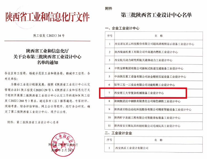 近日,陕西省工业与信息化厅发布了《陕西省第三批工业设计中心的通知》,公司申报的“复杂机械装备工业设计中心”获批为陕西省第三批省级工业设计中心。