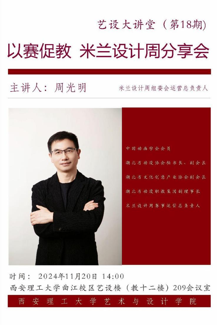 2024年11月20日,太阳成集团tyc122ccvip第18期“艺设大讲堂”邀请米兰设计周赛事运营总负责人周光明先生,为公司师生带来了一场主题为“以赛促教•米兰设计周分享会”的精彩讲座。此次讲座吸引了来自太阳成集团tyc122ccvip、印刷包装与数字媒体公司、土木建筑工程公司等多个公司师生的积极参与。