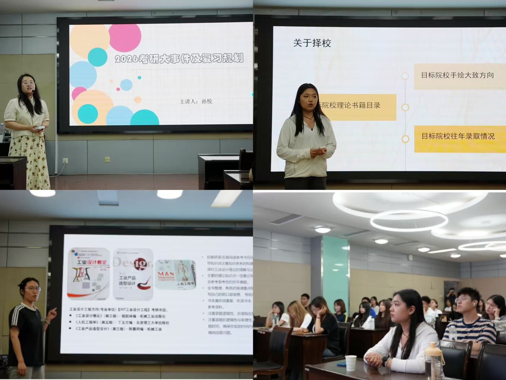 活动中,孙悦为同学们梳理了考研重要时间节点,详细解读了报名、初试、等关键环节的注意事项,以英语阅读、写作、翻译题型为主,讲解考研英语高效的提分策略和备考计划;郭歌结合自身考研经验,为大家讲解专业知识框架构建以及各阶段学习重点;刘欣就所学专业分享备考策略,她建议同学们要提前了解目标院校考试风格,有针对性地准备方案。活动现场气氛热烈。